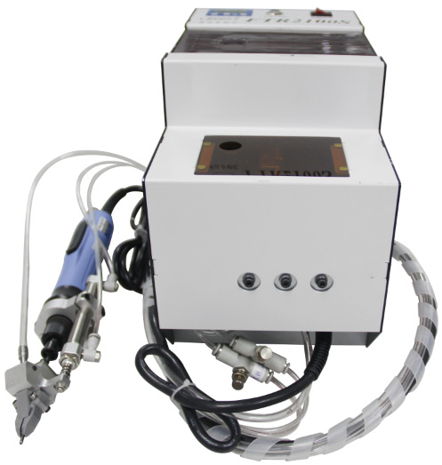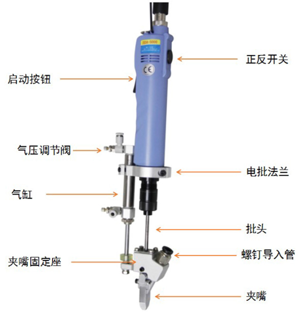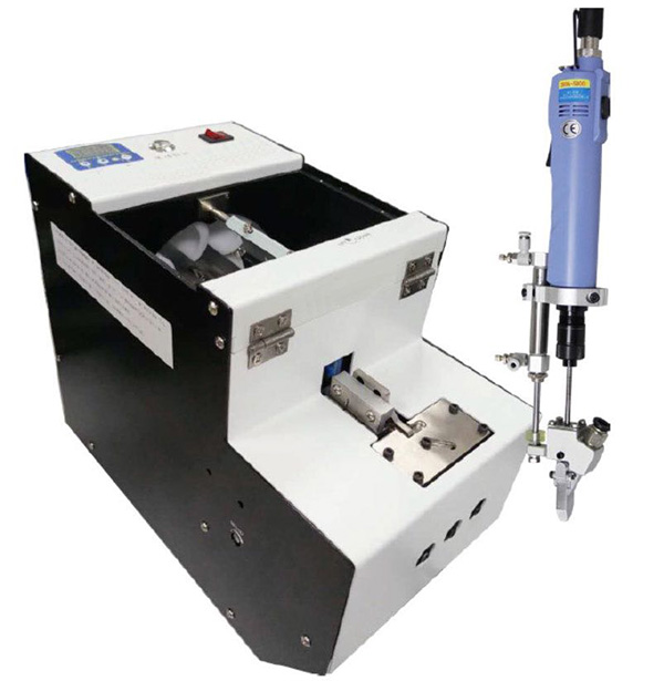 設備有送料機構(gòu)、分釘機構(gòu)、鎖付機構(gòu)、氣控系統(tǒng)、電控系統(tǒng)組成。螺釘采用自動分料裝置自動排序、分料、送料。工件由操作人員預組裝定位,然后手持伸縮式電動(或氣動)螺絲刀對準螺孔位置,下壓螺絲刀,啟動電動(風動)馬達,螺絲刀旋轉(zhuǎn)并將螺釘擰緊,達到設定扭力后,自動停止;提起螺絲刀,同時有一顆螺釘自動吹送到定位夾嘴中定位。